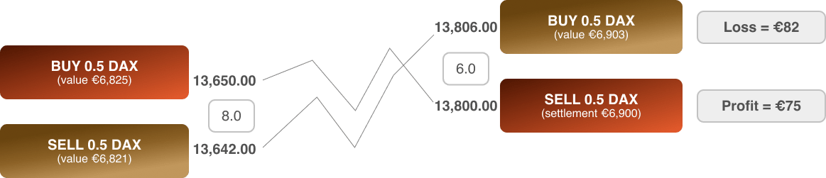 When you go long on the DAX, which means you expect the price to rise, you’re theoretically buying DAX with euros. To close the position, another trade in the opposite direction is used to offset it. Your profit or loss will be determined by the difference in value between the opening and closing orders. If the value of DAX increases, you’d end up with more euros when the position is closed. However, if the value of DAX falls, you’d end up with fewer euros.