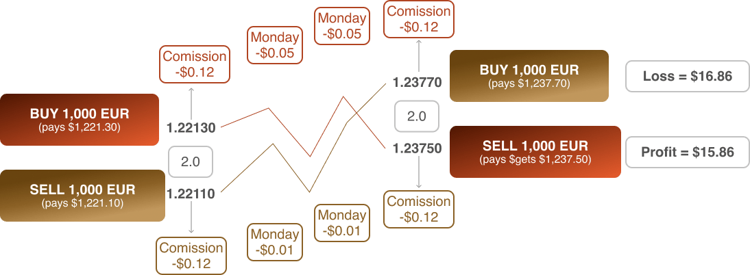 Commissions are charged when you open and close a trade. In this example, the commission charged is €10 per Lot. Once adjusted according to the trade size of 0.01 Lots the commission becomes €0.10. When converted to dollars, it becomes $0.12.