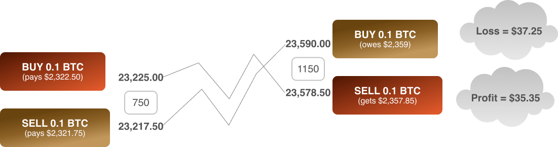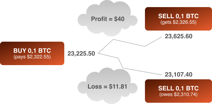 When you go long on BTC/USD, you’re technically buying BTC with dollars. When you close the trade, your profit or loss will be calculated in dollars. If the price of Bitcoin increased against the dollar, you’d get more dollars when you close the transaction. If the price of Bitcoin falls, you’ll get back fewer dollars.